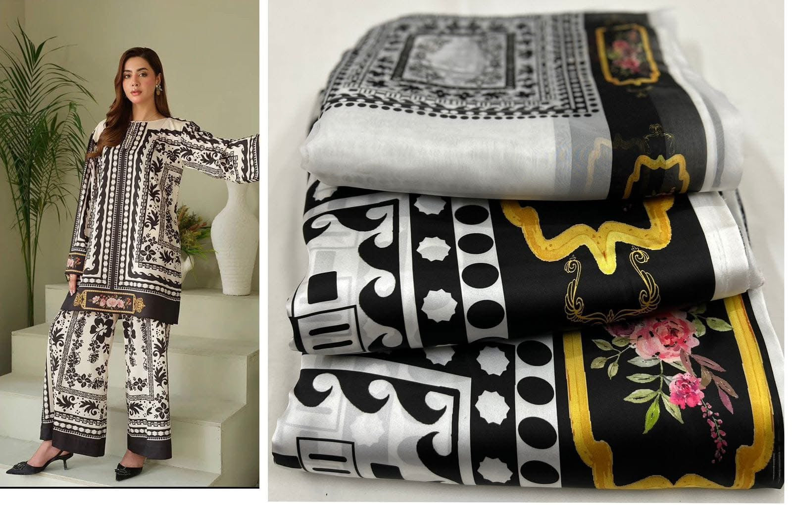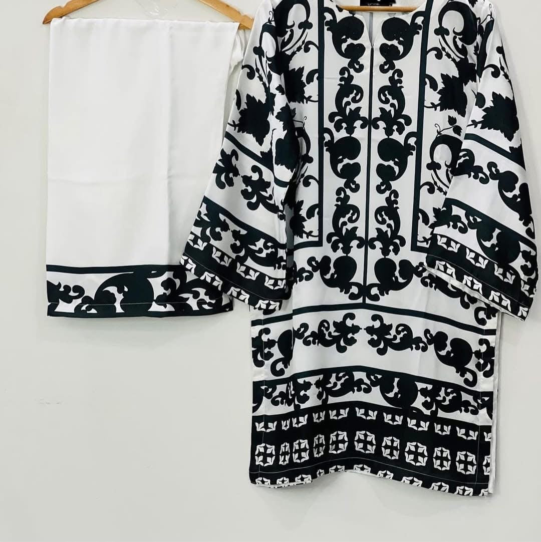 This three-piece Allover Digital Printed SILK set includes a shirt, trouser, and duppta made from high-quality Shamooz Sill fabric. The intricate digital printing adds a unique touch to these pieces, making them perfect for any special occasion. Elevate your style with this luxurious and beautifully crafted outfit.