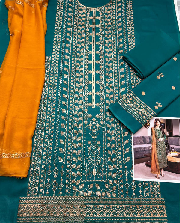 This Luxury Heavy Embroidered 3 PIECE is crafted with premium quality lawn, ensuring exquisite comfort and durability for the wearer. Experience luxury and elegance like never before with its intricate embroidery and superior material. Step out in style and make a lasting impression with this must-have piece in your wardrobe.